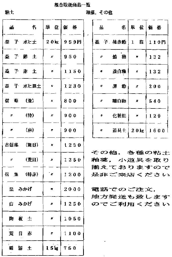 各種の道具や材料を扱っています。粘土の種類も豊富です。 |