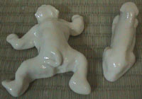 | 2003年1月7日の窯出し。焼成温度1220度。焼成時間は昇温エラーとブレーカーオフにより不明(だいたい15時間くらい。練らし15分)。今回は冷却時も1時間当たり100度で900度まで電熱線をオンした。効果が有ったのかは、これまた比較対象がなくて不明。志野は焼成としてはまあまあ成功かと思えるが、デザインの大切さを痛感した。土は全てもぐさ土(羊たちを除く)。 | |||||||||||||||||||||||||||